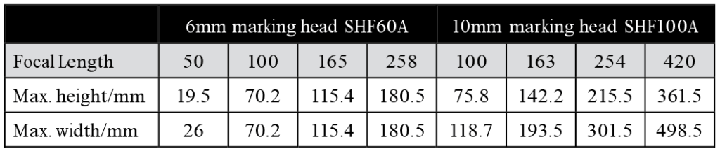 Focal lengths 10mm marking head: f = 100/ 163/ 254/ 420mm